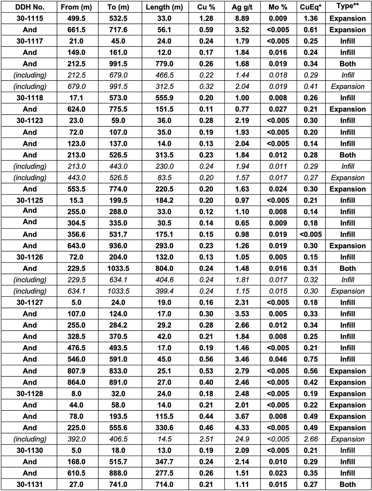 Drill hole 30-1117, located on the western flank of Copper Mountain, cut three mineralized intervals including 779.0 metres averaging 0.26 % Cu, 1.68 g/t Ag and 0.019% Mo (which includes 312.5 metres of depth expansion), extending mineralization in this area to a vertical depth of 991 metres.